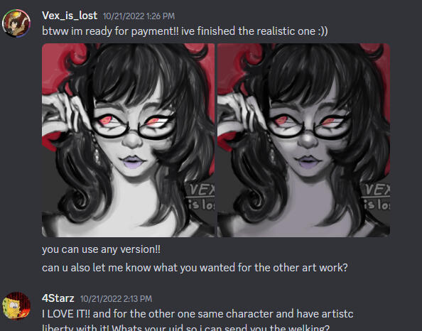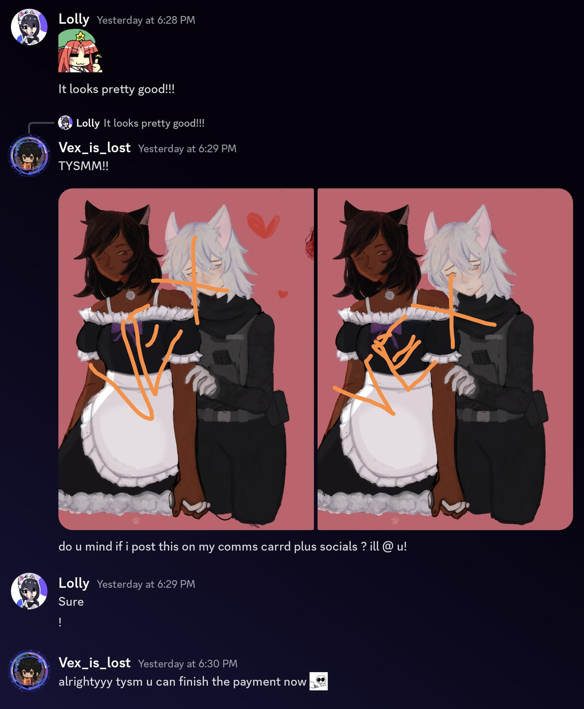 - FOR BIG PAYMENT COMMS - 50/50 payment - After the sketch, I will ask for half of the payment and the other half after it is finished.